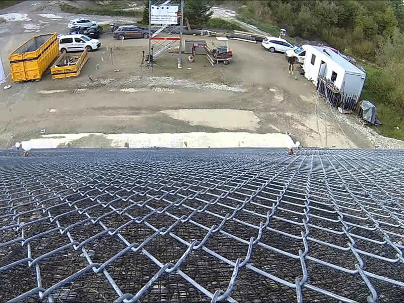 将钛克网掩盖在有潜在地质灾害的坡面上;钛克网预应力锚杆对钛克网部分完成预张,然后对整个边坡构成连续支撑,钛克网预张拉工作使系统尽可能紧贴坡面并构成了按捺部分岩土体移动或在发生部分位移或损坏后将其裹缚(逗留)原位邻近的预应力,然后完成钛克网主动防护(加固)功用。
